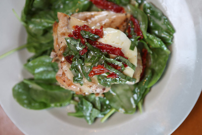 Grilled chicken breast, sundried tomatoes, goat cheese, lemon basil beurre blanc, baby spinach. 16